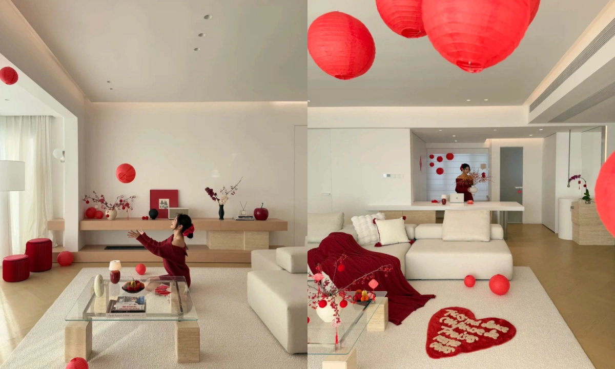 Căn hộ 135 m2 được gia chủ giữ màu nền tối giản, bổ sung sắc đỏ và đồ trang trí để tạo không khí Tết.
